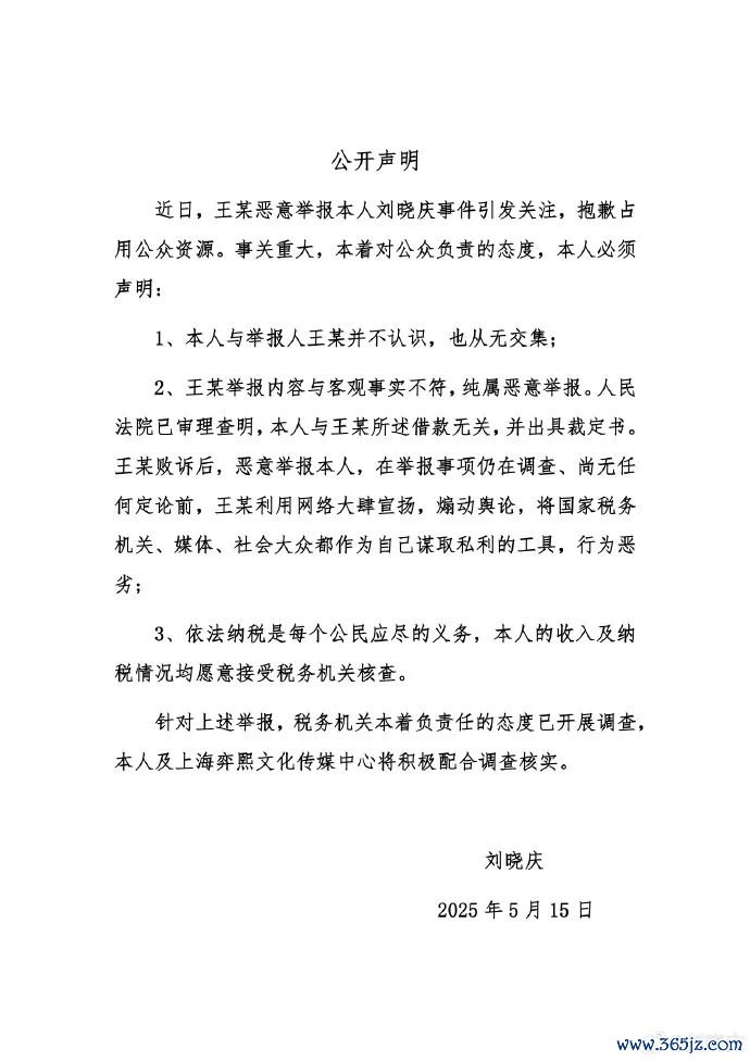5月15日2025配资查询网站官网,演员刘晓庆发布声明称:“本人与举报人王某并不认识,也从无交集。王某举报内容与客观事实不符,纯属恶意举报。”